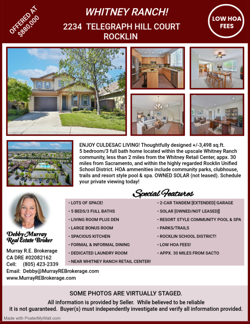 WELCOME to the upscale Whitney Ranch community appx. 30 miles northeast of Sacramento close to Hwy 65 and I-80. Designed for comfort and functionality, this +/-3,498 sq.ft. move-in ready home is conveniently located within the highly regarded Rocklin Unified School District – just a short distance from Sunset Ranch Elementary, Whitney HS, and Brigham & Hawes Park. It is less than 2 miles from the soon to open Whitney Ranch Retail Center featuring stores like Nugget Market and Chipotle! Tucked away at the end of a CULDESAC, this home has ample space with 5 bedrooms and 3 full baths. The ground floor has formal and informal dining/living areas, a spacious kitchen with stunning granite countertops, stainless steel appliances, 2 ovens, beautiful center island w/informal seating, large pantry, and lots of cupboard space! A good-size dedicated laundry room with additional pantry closet, bedroom and full bath are on the ground floor too. The spacious second level primary suite boasts an ensuite bathroom with double vanity sinks, walk-in shower, soaking tub, and large walk-in closet with built-in shelving. The upstairs also features three additional guest rooms, and a large versatile bonus room which can be used as a play/game room, media center, office, and/or gym! As an additional plus, the home has OWNED solar panels (NOT LEASED), and a dual-zone HVAC too! Step outside to the backyard patio for relaxation with family & friends. While HOA FEES ARE LOW, the amenities are many – including neighborhood parks, trails, and a resort style clubhouse w/sauna, fitness center, and sparkling pool to help keep you cool during Rocklin’s hot summer days. And as a Whitney Ranch resident you can also enjoy lively year-round community events. Don’t miss out on this amazing opportunity to live the culdesac dream within this idyllic Whitney Ranch community. Make an appointment to tour this wonderful home today!
